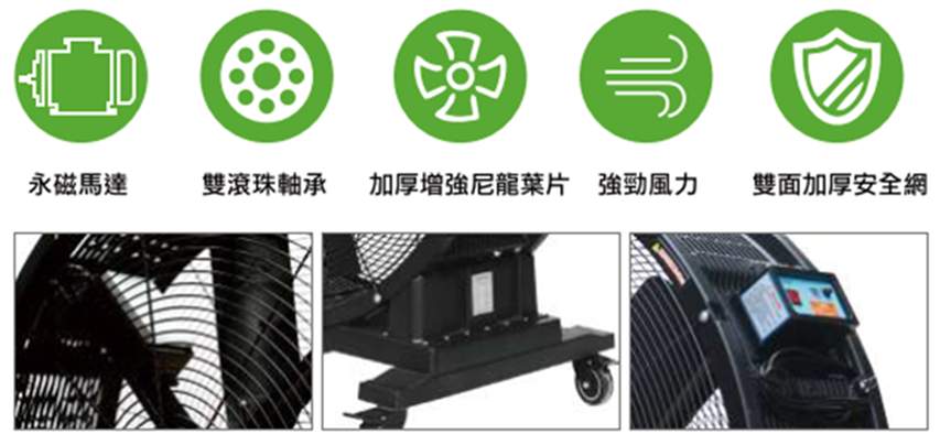 l 空氣力學設計葉片,風力強勁;高密度網罩,安全保護
