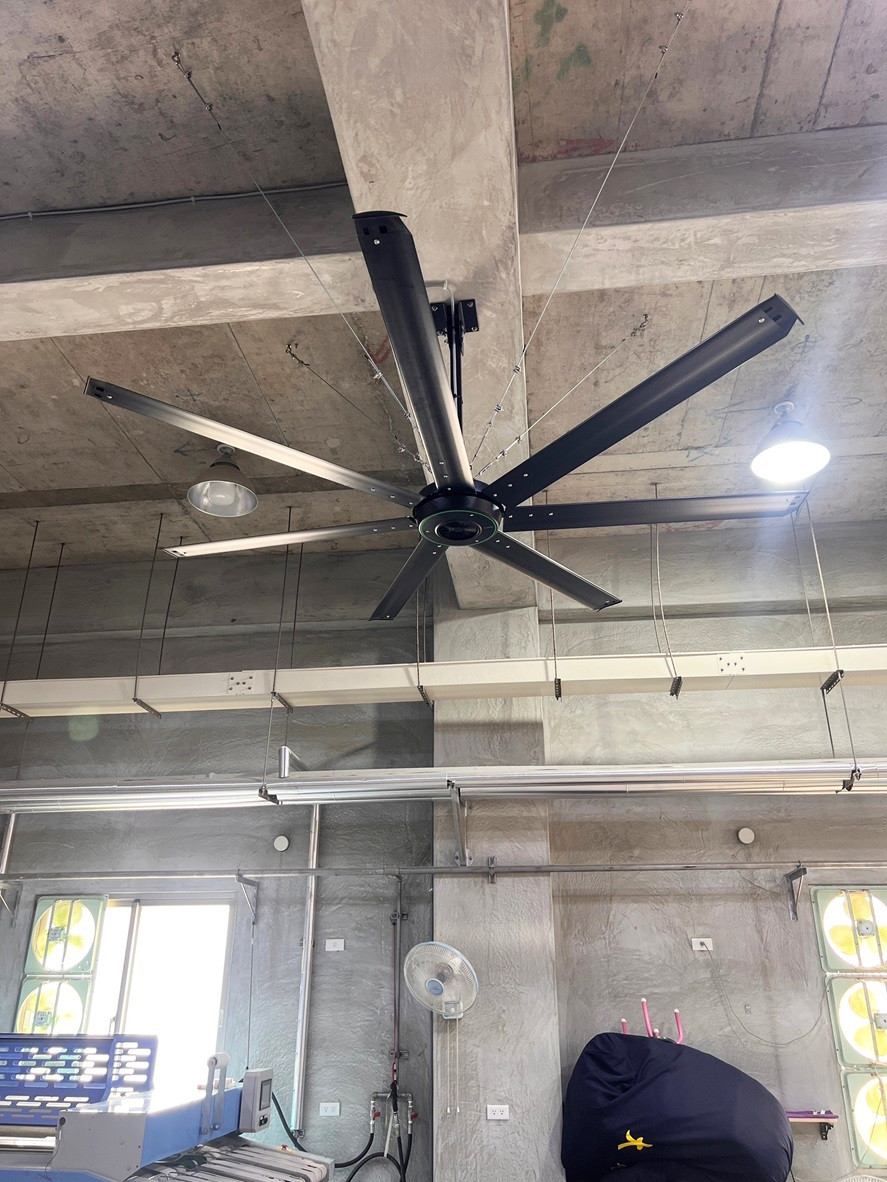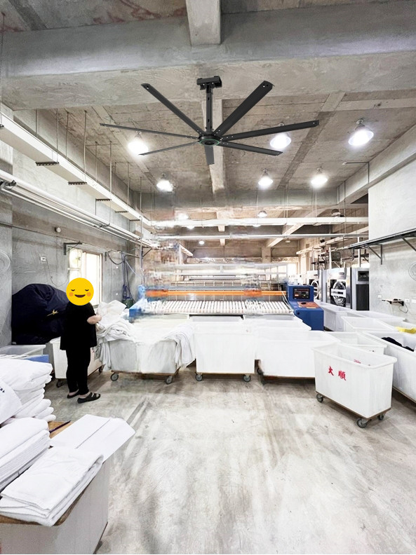 位在澎湖的大順洗衣店內部環境悶熱,特別是在使用蒸汽設備時會產生高溫。為了解決這個問題,洗衣店安裝了Powerful Series 3_2.5米 節能工業吊扇。