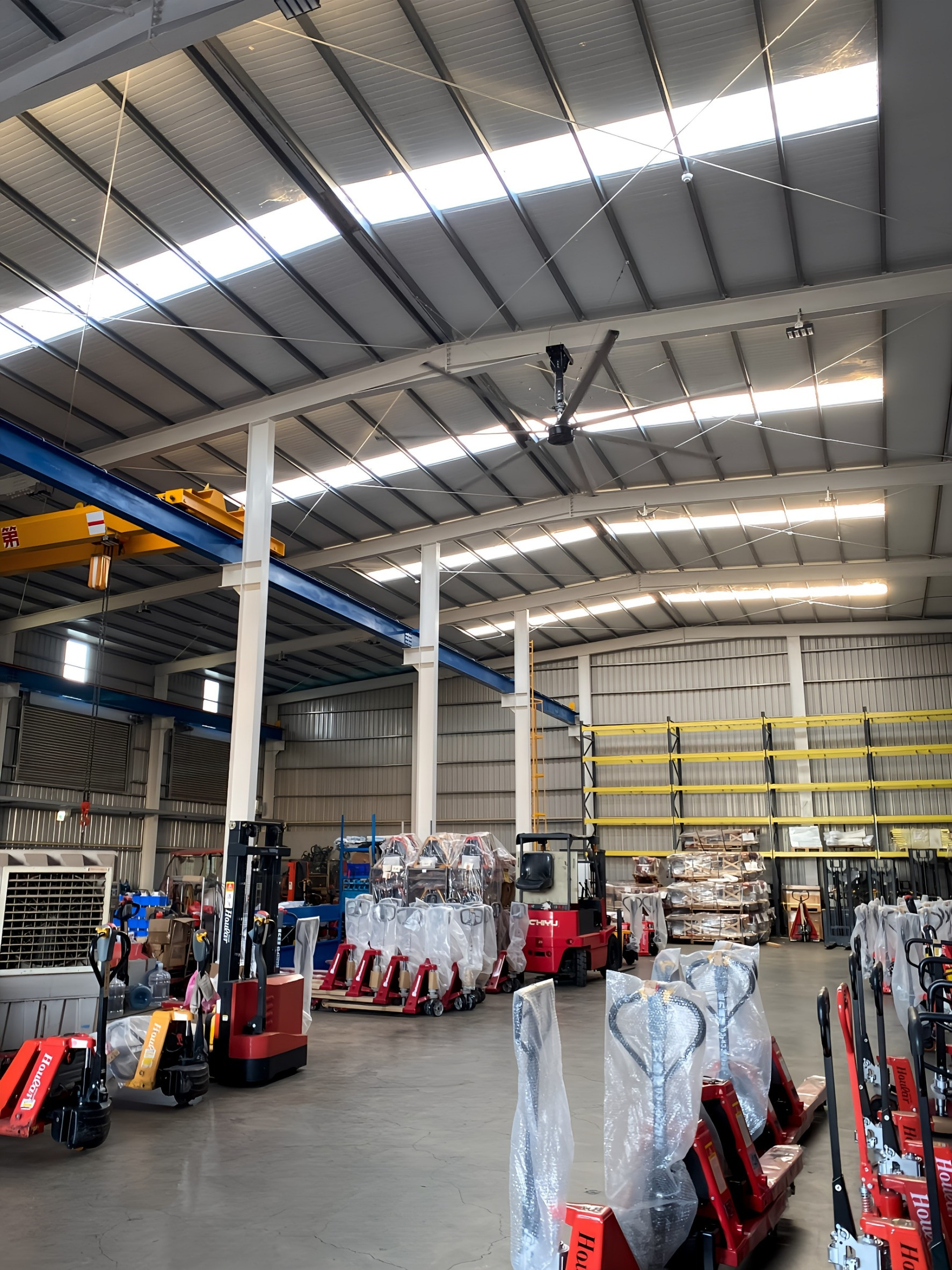 位於中壢的板車王有限公司,由於廠房較深,加上內部擺放了各式電動拖板車和堆高機,前來參觀的客人也逐漸增多,使得空氣流通不佳,常常感到悶熱。