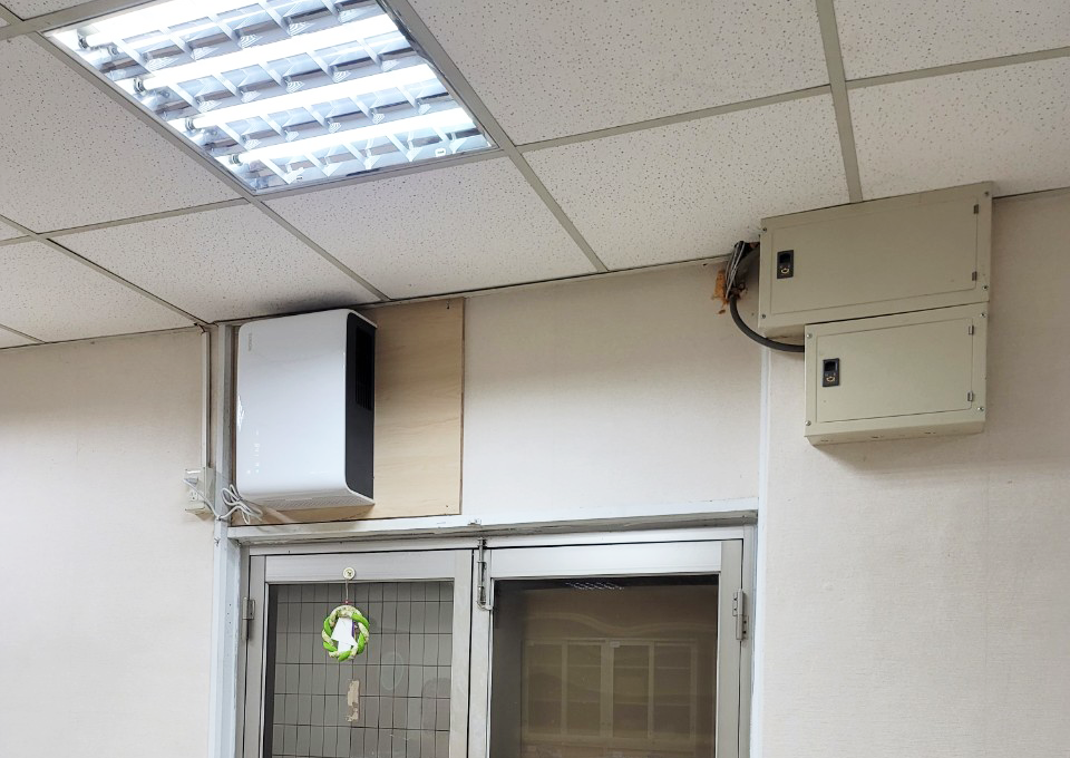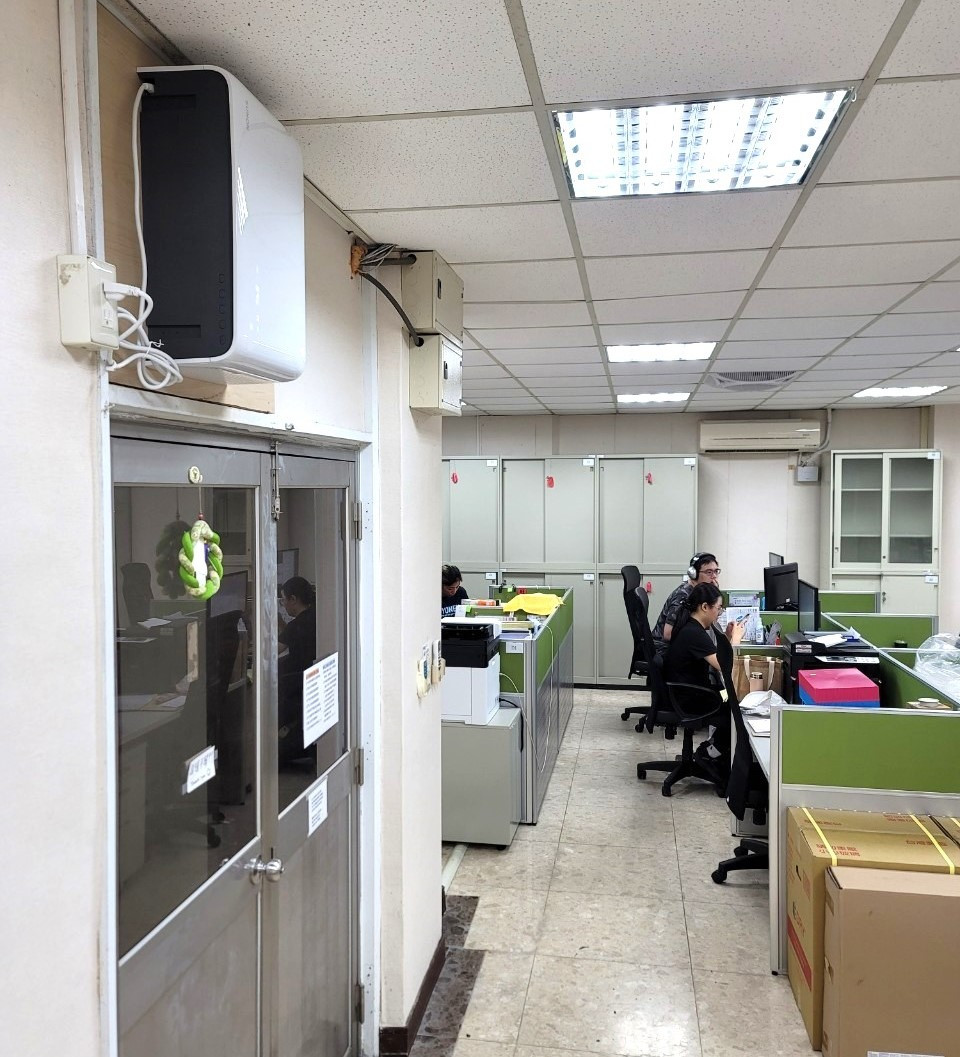 一開始校方採用一般小吃店常使用的排風扇,但效果不彰,因此透過發明家好空氣專業建議,選擇𝙁𝙡𝙤𝙬2𝙤𝙣𝙚 𝙋𝙡𝙪𝙨+綠境風-雙流新風機,由於天花板空間受限,於是調整雙流新風機安裝方向,透過側向吸風方式淨化空氣,明顯將二氧化碳濃度及PM2.5下降,提昇室內環境空氣品質,讓教職員都表示辦公室的空氣變好了耶!