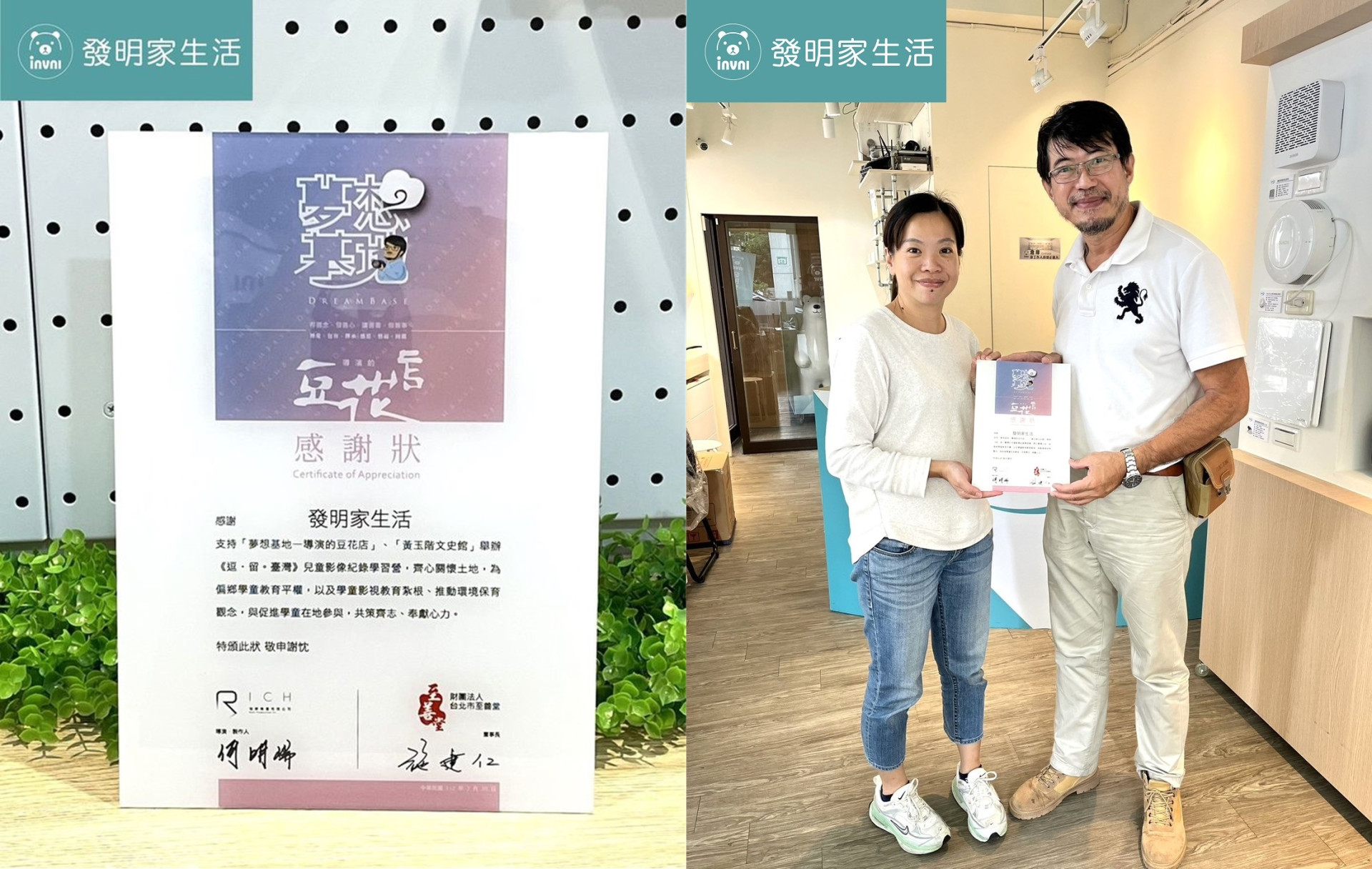 Latest News 最新消息 首頁 最新消息 最新消息 全部分類 最新消息 2023-10-18 最新消息 「導演的豆花車 」感謝狀 感謝 導演的豆花車 讓發明家有可以提供服務的機會,來幫助孩童實現夢想 紀錄片導演 #何明瑞, 從事影像工作超過30年 用鏡頭記錄下無數美景與人生百態 打造一臺導演的豆花車,跑遍臺灣 用豆花,最平民的美食溫暖人心 用攝影,帶著孩子重新看見自己的家鄉 為了信守與齊柏林的約定「你就好好地在天上飛,我在地上追。」 儘管高度不同,一樣能跑出寬闊的視野 一樣,能為臺灣,帶來改變。 回上一頁