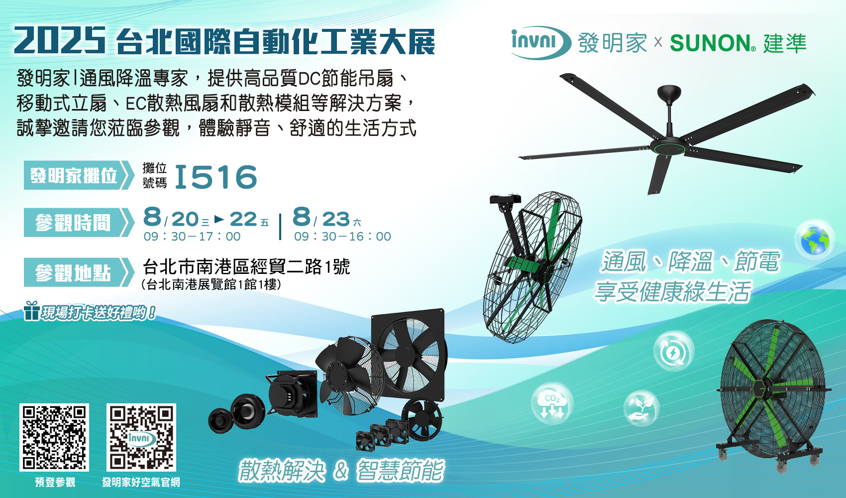 Latest News 最新消息 首頁 最新消息 最新消息 全部分類 最新消息 2025-07-16 最新消息 【2025台北國際自動化工業大展】 📢 【2025台北國際自動化工業大展】 發明家集團將參加 2025台北國際自動化工業大展,誠摯邀請您蒞臨參觀!此次展覽中,我們將展示多款高效節能的專業風扇解決方案,現場並有專人為您介紹與解說,期待與您交流! 📍 展覽資訊 展名:2025台北國際自動化工業大展 日期:2025/8/20 (三) ~ 8/23 (六) 時間:每天 9:30 - 17:00(最後一天至 16:00) 地點:台北南港展覽館一館1樓 攤位號碼:I516 ✨ 歡迎蒞臨,與我們一起探索更多創新與應用! 回上一頁
