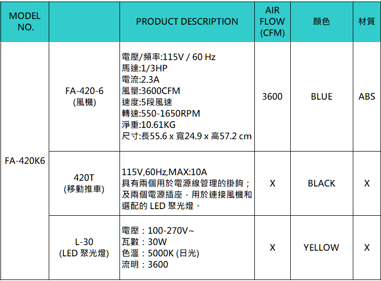 ※FA-420K6 完整套件包括移動手推車和強大的軸流風扇