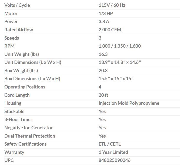 ※低 3.8 安培電流,最大氣流容量 2000 CFM