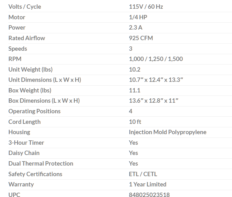 ※低 2.3 安培電流,最大氣流容量為 925 CFM