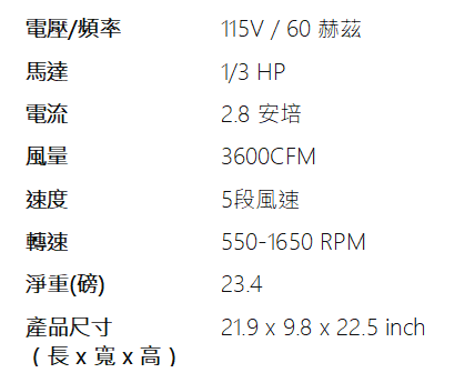 ※強大且高效 – 3600 CFM 採用先進的高扭矩馬達和獨特的格柵設計,集中氣流高達 120 英尺以上,3600 CFM 同時僅畫出 2.8 安培。