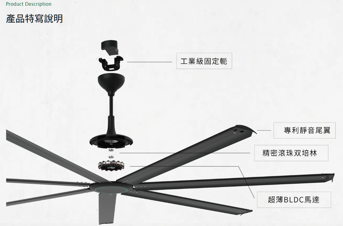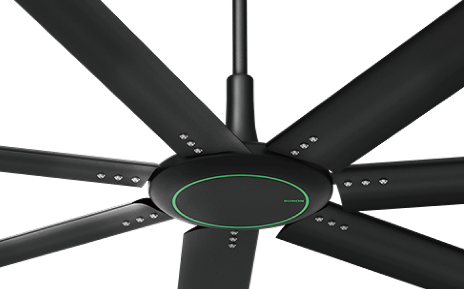 SUNON Powerful HVLS Fan 工業節能大吊扇,融入禪風追求內在寧靜平和與沉穩內斂的人文美學精神於產品發展的核心理念。 Series 1 輕量化的外型結合飛機級鋁製葉片與專利尾翼設計,能有效降低風阻平穩運轉、消除噪音,整個產品素雅極簡的外型搭配慢速靜音的特性,十分適合沒有挑高天花板的商業空間。質輕超薄無壓迫感機身,吹出沉穩而寧靜的風 ,能有效節能通風並保持商業空間的寧靜,打造一個使用者體驗有舒適自然風感的空間。