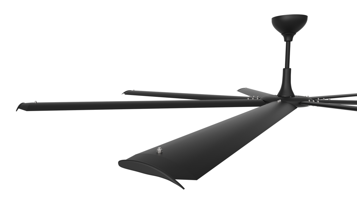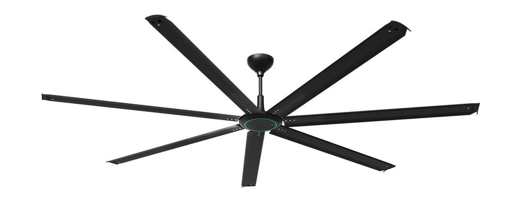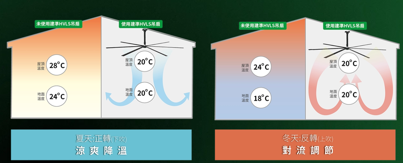 Powerful HVLS Fan 工業節能大吊扇 可驅動大面積的柔順風流,在一般氣溫下,可取代空調,夏天讓工作人員體感溫度可感受 5-8度的溫差。舒適的環境溫度,有效提高工作效率。冬季可切換反轉模式,將囤積在屋頂的熱氣順推下來,降低室內溫差,達到自然調節溫度的作用。因此搭配空調系統使用時,能有效降低製冷與製暖成本25%~30%。