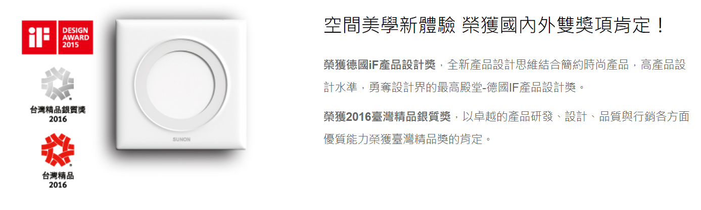 『SUNON綠能換氣產品』是源自於建準集團多年來專注直流馬達技術的研發,針對建築通風需求,開發一系列超節能直流換氣扇,以更節能 80%、靜音、防水等高技術下,提供民眾安全、健康、舒適、節能的通風產品,打造健康舒適、綠色居家生活!產品以「極簡」風格、新穎現代感的設計為初衷,顛覆傳統通風生硬外型轉換為時尚簡約的美感呈現給現代化居家,讓產品不再只是產品,幻化成居家裝飾品。